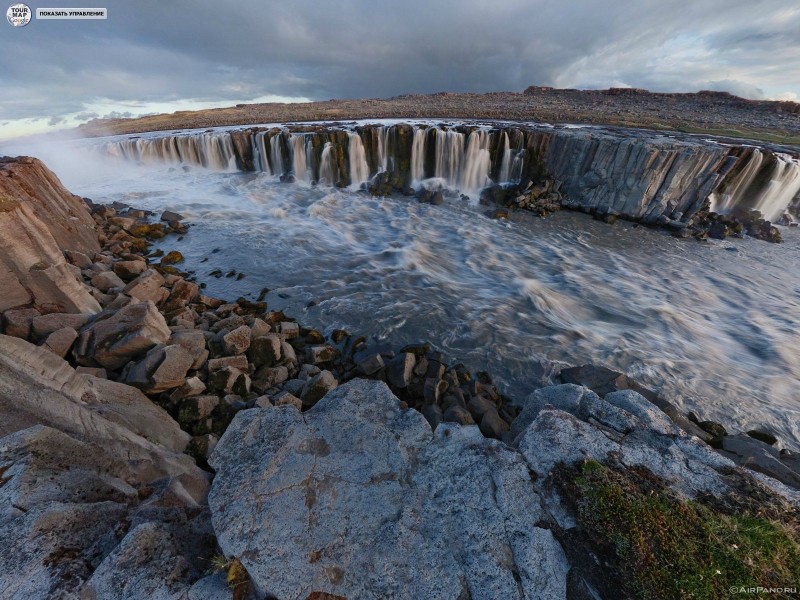 Очень необычный водопад Selfoss (Селфосс). Не путать с одноименным городом. Этот водопад находится в полукилометре вверх по течению от гораздо более известного Деттифосса – самого мощного водопада Европы. Для масштаба – высота “стенок” этажа 4 (и снято в полночь).