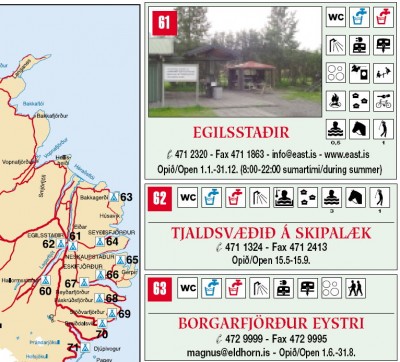 Guide “Camping areas around Iceland” (PDF ~ 3 Mb). Maps, description, phones etc. about each camp.