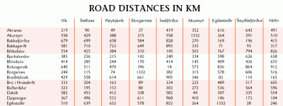 Road distances between 75+ towns and major locations in Iceland (PDF ~ 80 Kb, 1 page)