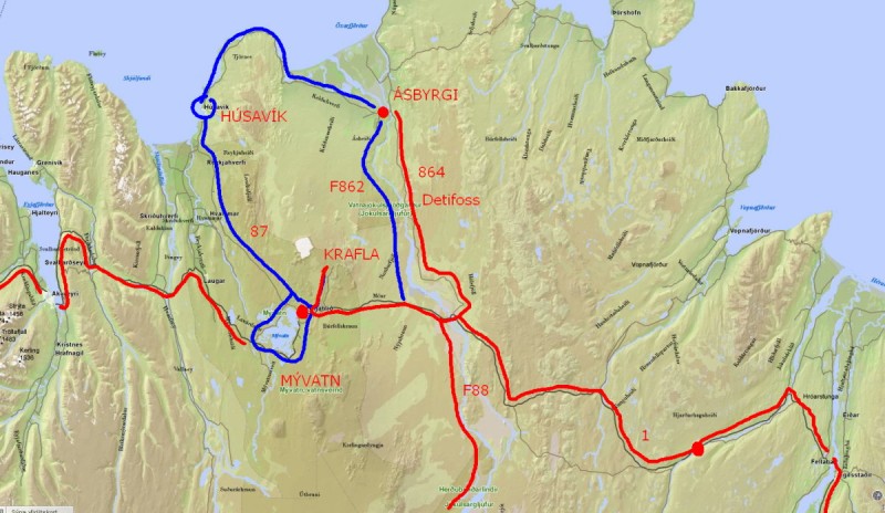 Теперь про Детифосс и Миватн. Не вижу смысла возвращаться от Asbyrgi обратно к месту стоянки. Или уж возвращаться по другой стороне реки (и водопада) – F862. Но если водопад не понравится – то лучше “рвануть” через север до Хусавика и вернуться к Миватн по дороге 87 . Озеро нужно объезжать по кругу, съезжая “внутрь”, где можно (если нет изгороди – значит можно).