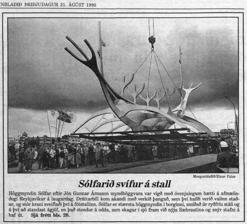 Sólfar ( Sun Voyager) – самое, пожалуй, известное и узнаваемое произведение исландского искусства (помимо Бьорк). Его автор – Jón Gunnar Árnason (1931 – 1989) по первой специальности был механиком. Sólfar означает буквально “солнечный корабль”, в то время как английская версия Sun Voyager переводится как “солнечный вояжер” (по аналогии с коммивояжером). Лично мне больше нравится Солнечный Странник – очень подходит этому сплаву из форм судов викингов и блистающей стали в окружении моря и неба. Впрочем, сам автор называл его именно кораблем
