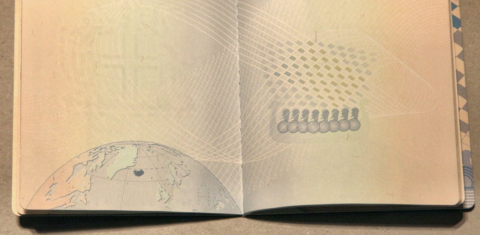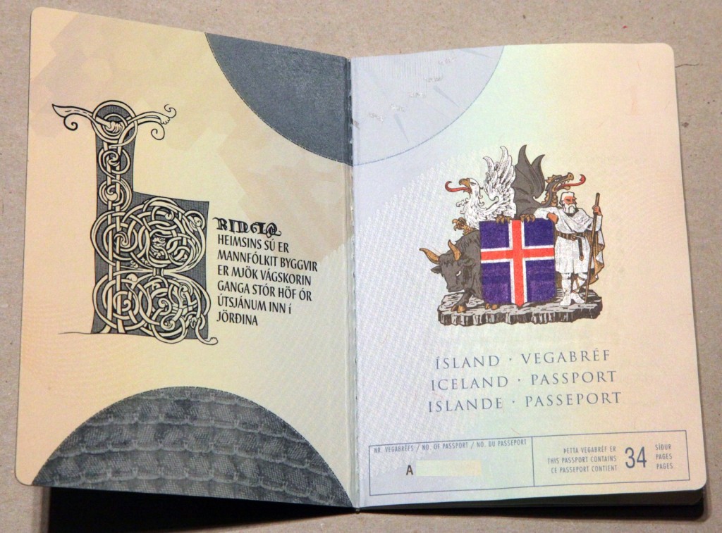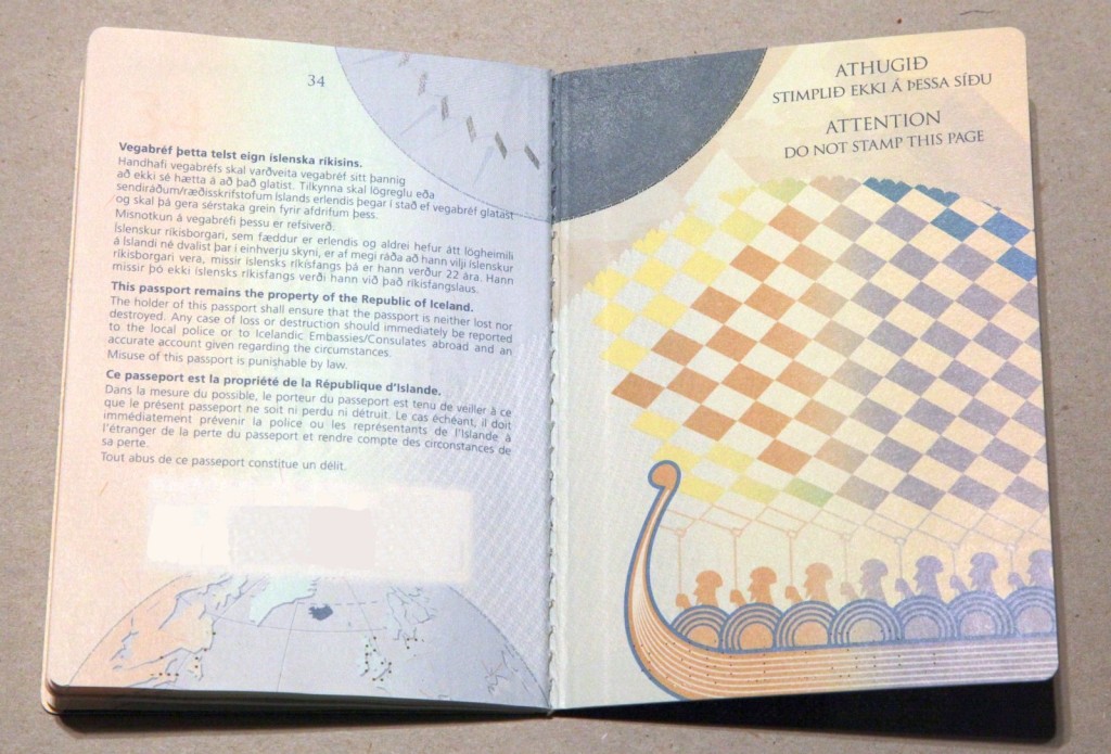 Простой исландский паспорт. Скромно но со вкусом. Больше всего мне нравится, что на всех страницах паспорта есть часть глобуса с Исландией. Очень удобно – многие работники паспортных контролей понятия не имеют, где эта ЛедянаяСтрана находится :)